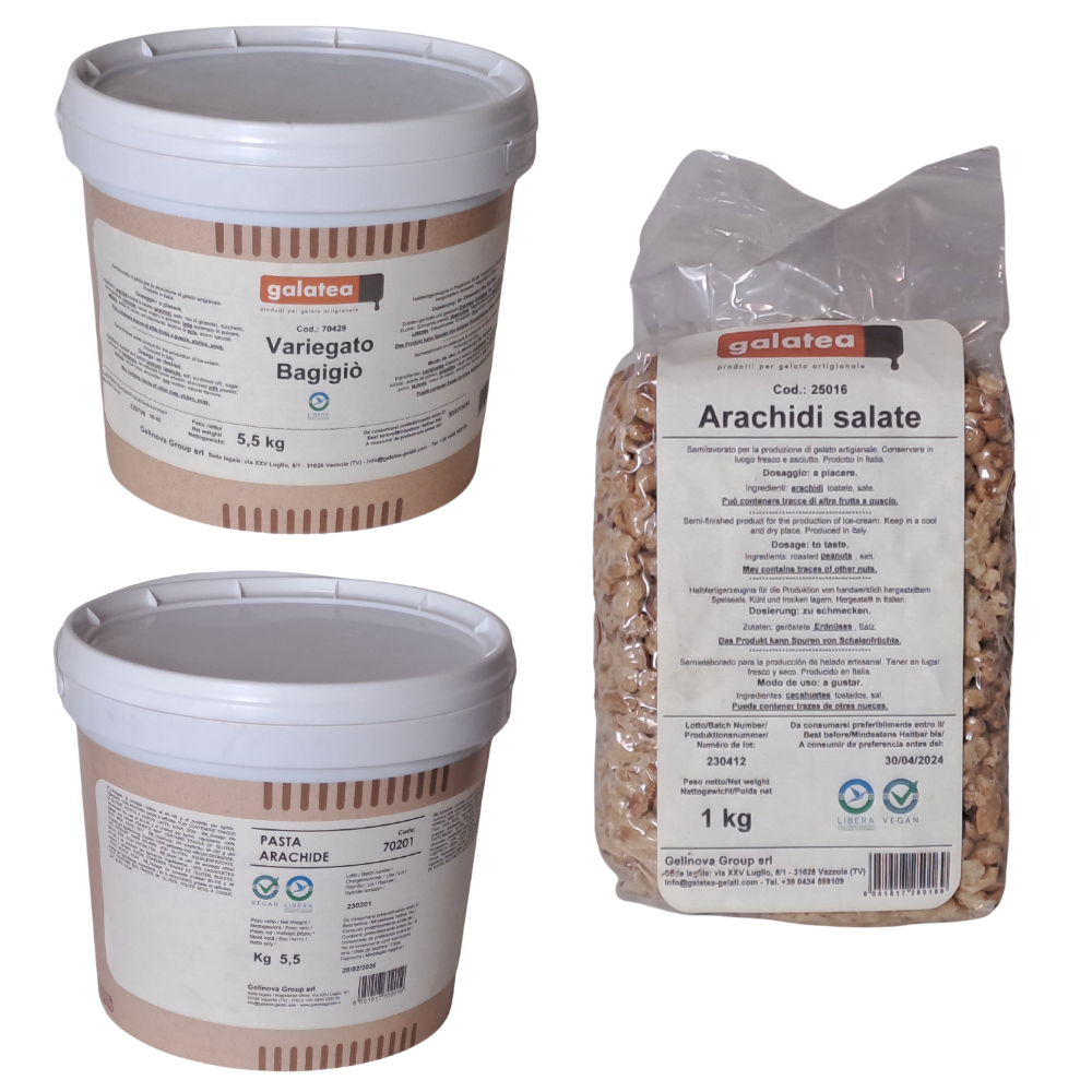- Variegato Bagigio: Această compoziție specială nu doar că intensifică aroma de arahide, dar și îmbunătățește prezentarea vizuală a gelato-ului.