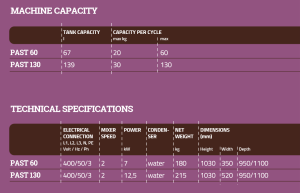 - Specificații Tehnice: Alimentare electrică trifazată de 400/50/3, cu o putere a mixerului de 2 kW pentru modelul PAST 60 și 2,5 kW pentru modelul PAST 130.